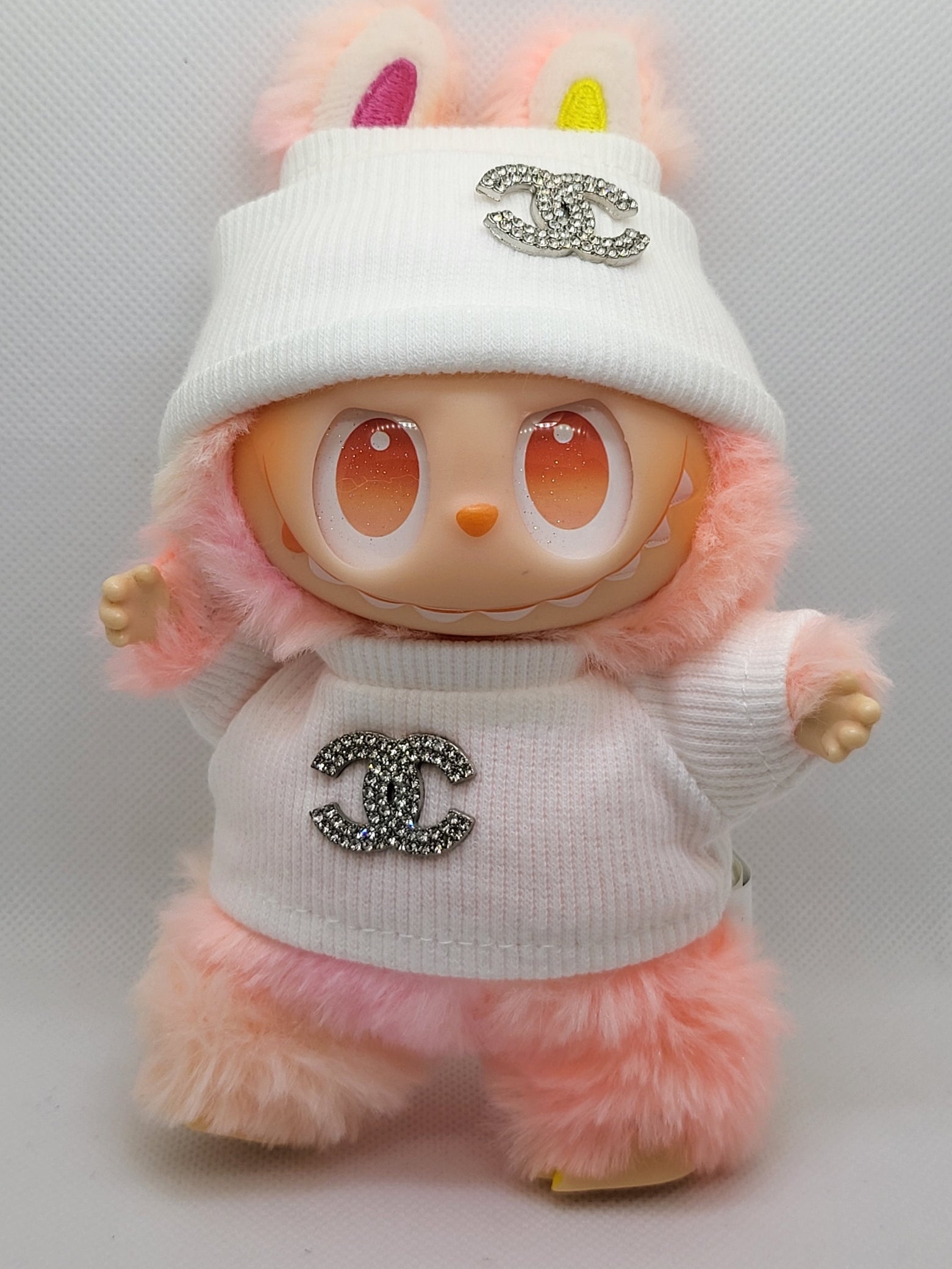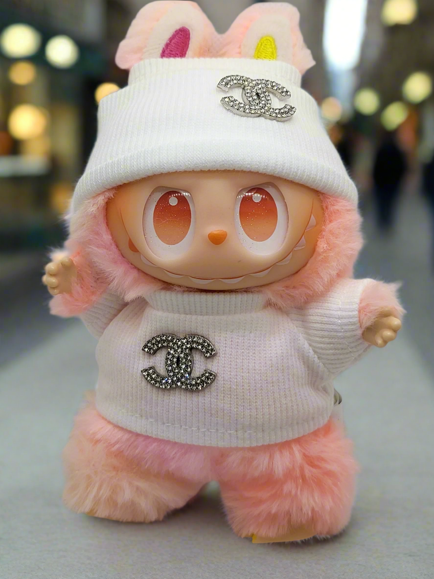 The Labubu Couture Luxe – White & Silver radiates elegance with a playful twist. This ensemble pairs a sparkling rhinestone-embellished white knit top and matching beanie with Labubu’s fluffy pink fur for a look that balances luxury and cuteness. Perfect for collectors who love high-fashion Labubu style with a glamorous touch.