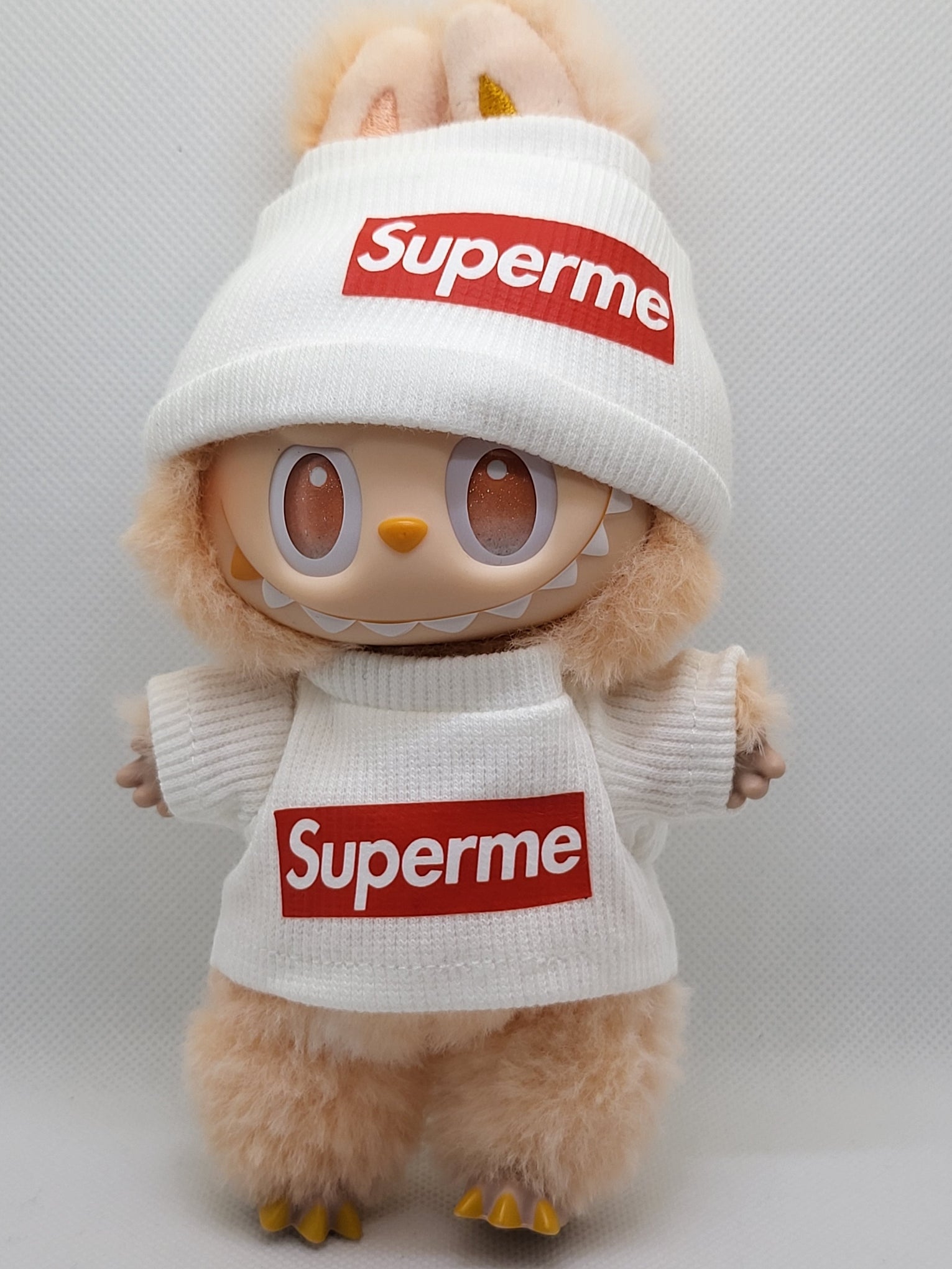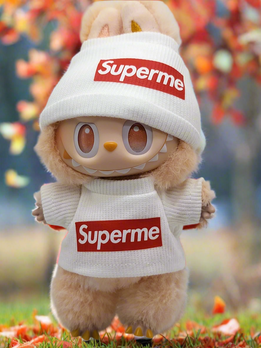 The Labubu Luxe Street Classic – White Supreme Edition brings bold energy and iconic style to your collection. Dressed in a crisp white knit set with striking red logo details, this Labubu combines playful cuteness with the unmistakable edge of street fashion. A must-have statement piece for collectors who love their Labubu dressed in high-impact style.