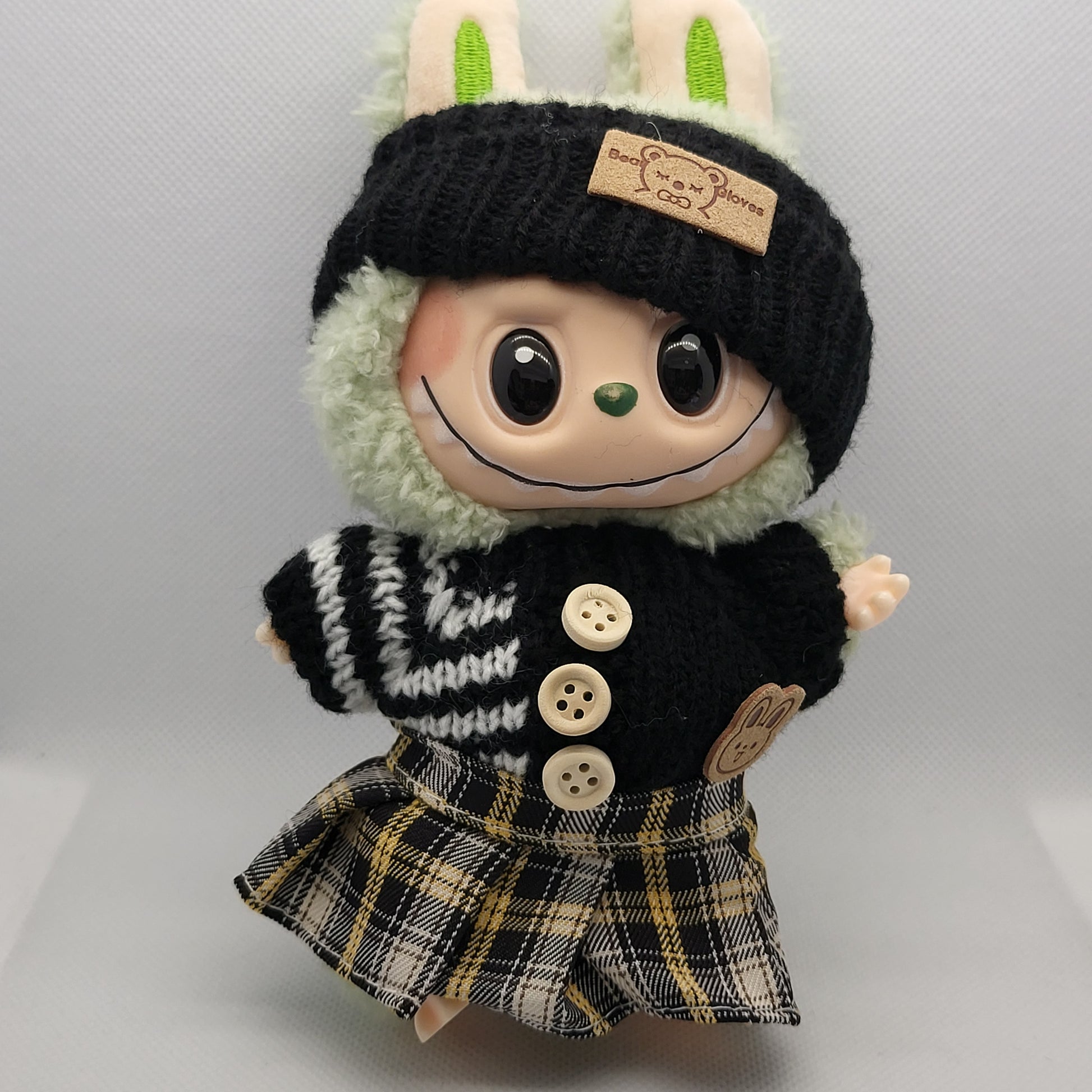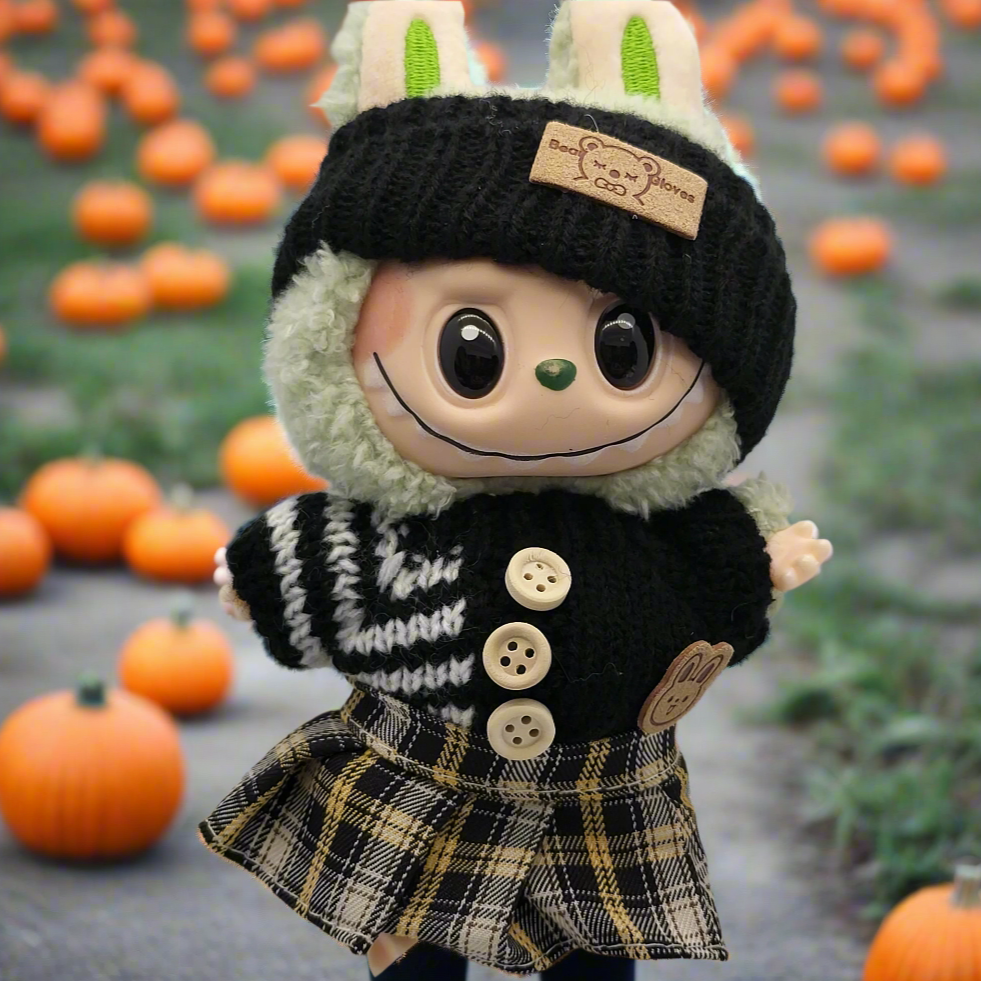 Labubu Outfit - Black Knitted Sweater Skirt Set w/ Matching Black Knitted Hat