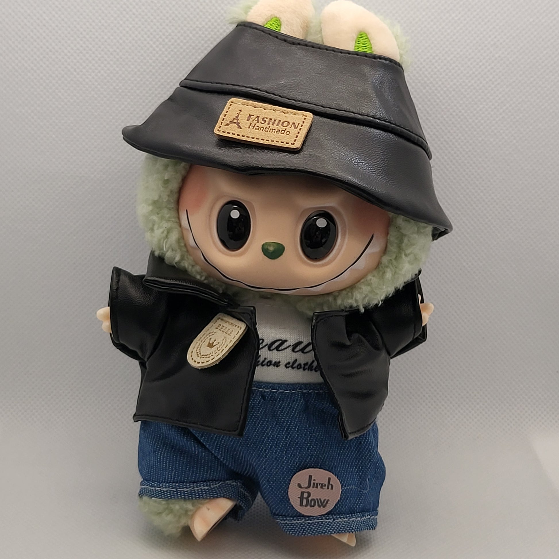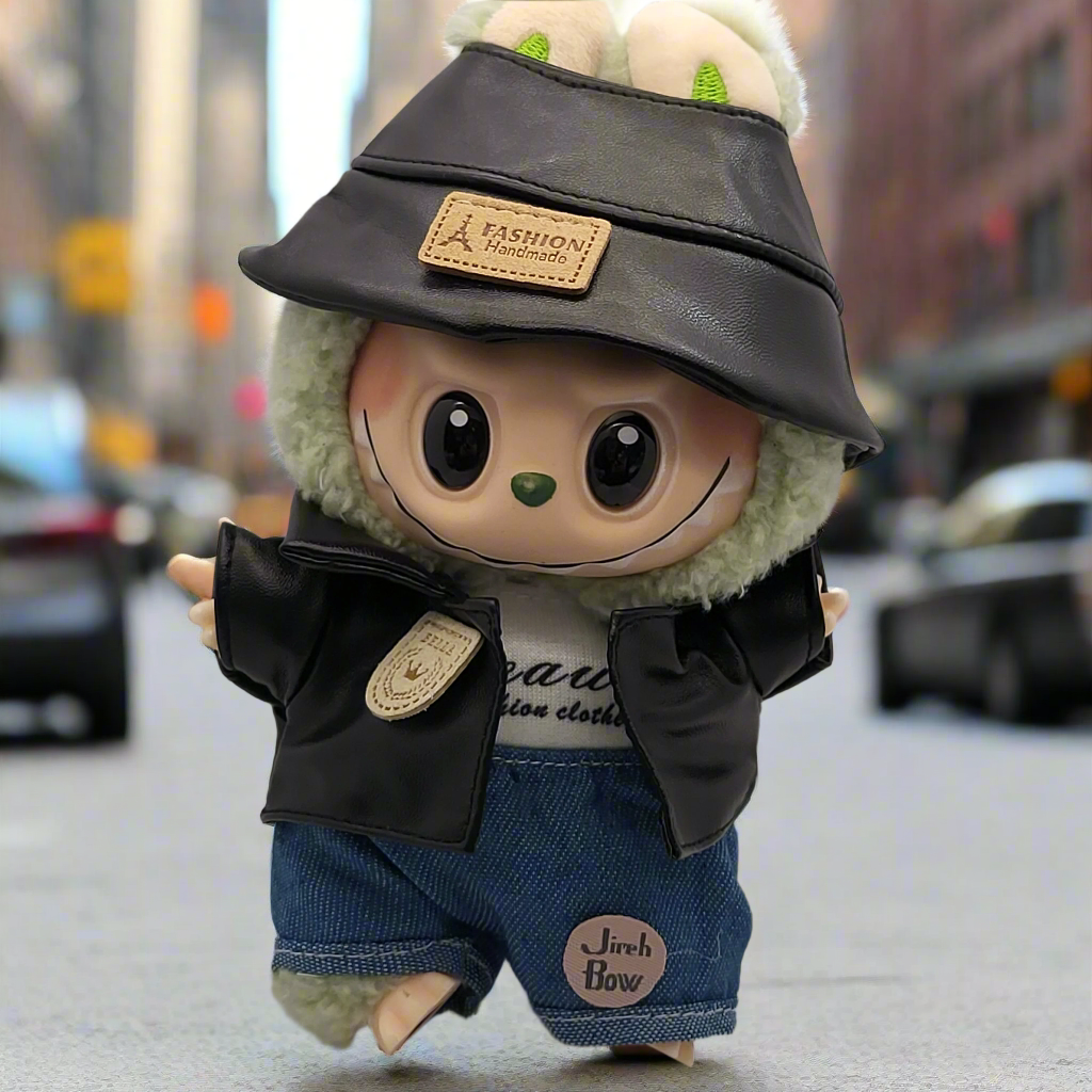 Labubu Outfit - Black Leather Jacket & Denim Jeans Set w/ Matching Black Leather Hat