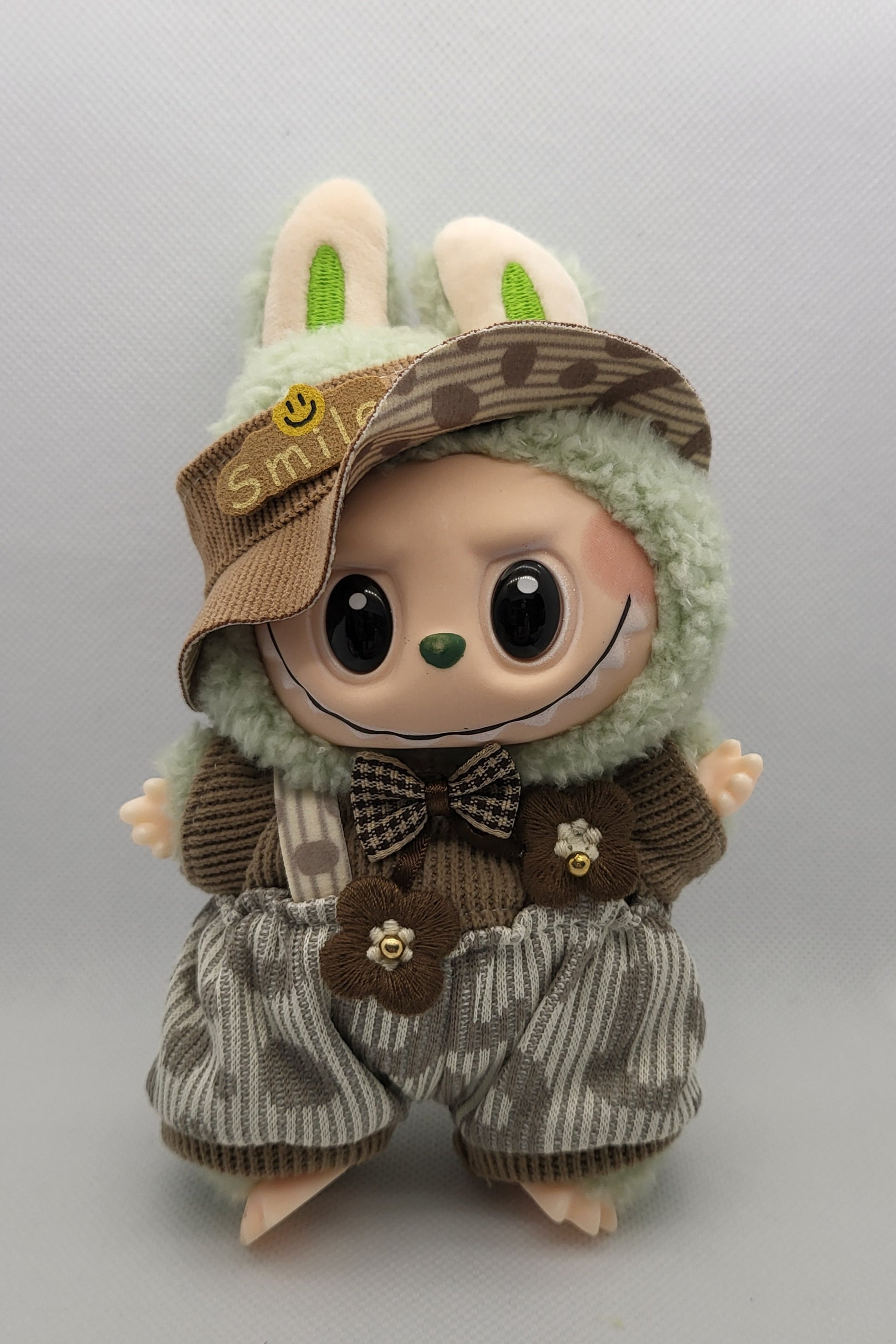 Labubu Outfit - Brown & Gray Overalls Set w/ Matching Bucket Hat