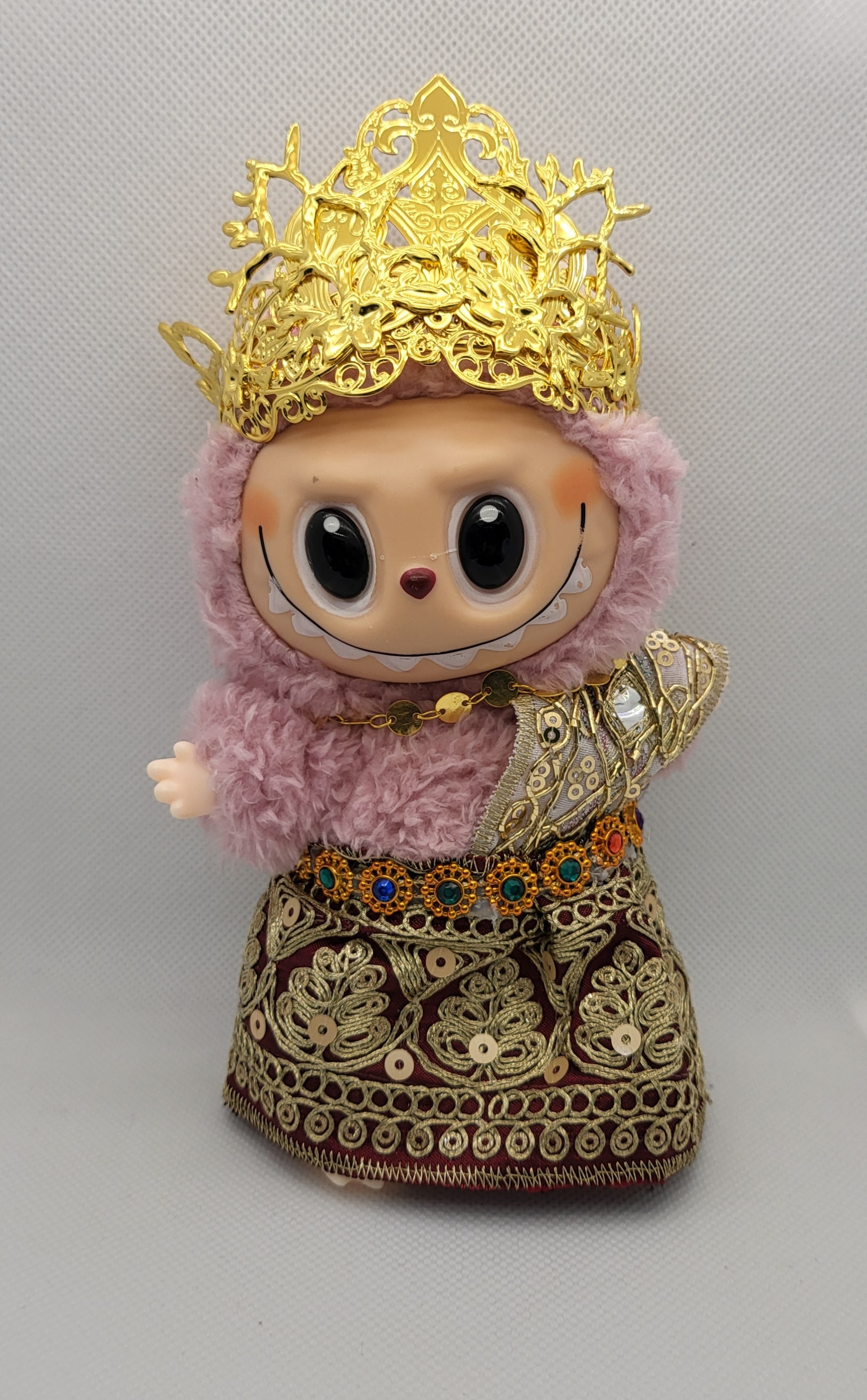 Labubu Outfit - Gold Embroidered Dress Set w/ Multicolored Jeweled Belt & Ornate Golden Crown